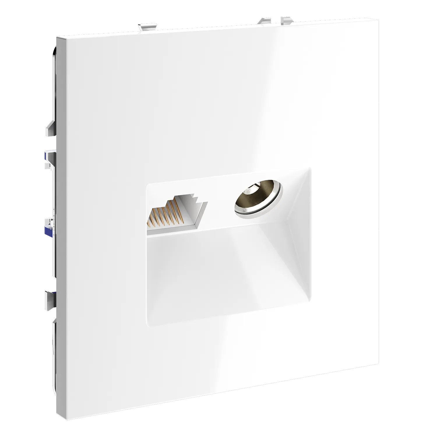 Это свет, отражённый в каждой детали. Розетка S70 TV+RJ45 VOLTUM в белом глянцевом исполнении превращает техническую точку подключения в элемент воздушной лёгкости: антенна и гигабитный интернет скрыты за фасадом сияющей чистоты, где цифровая стабильность встречается с визуальной гармонией.